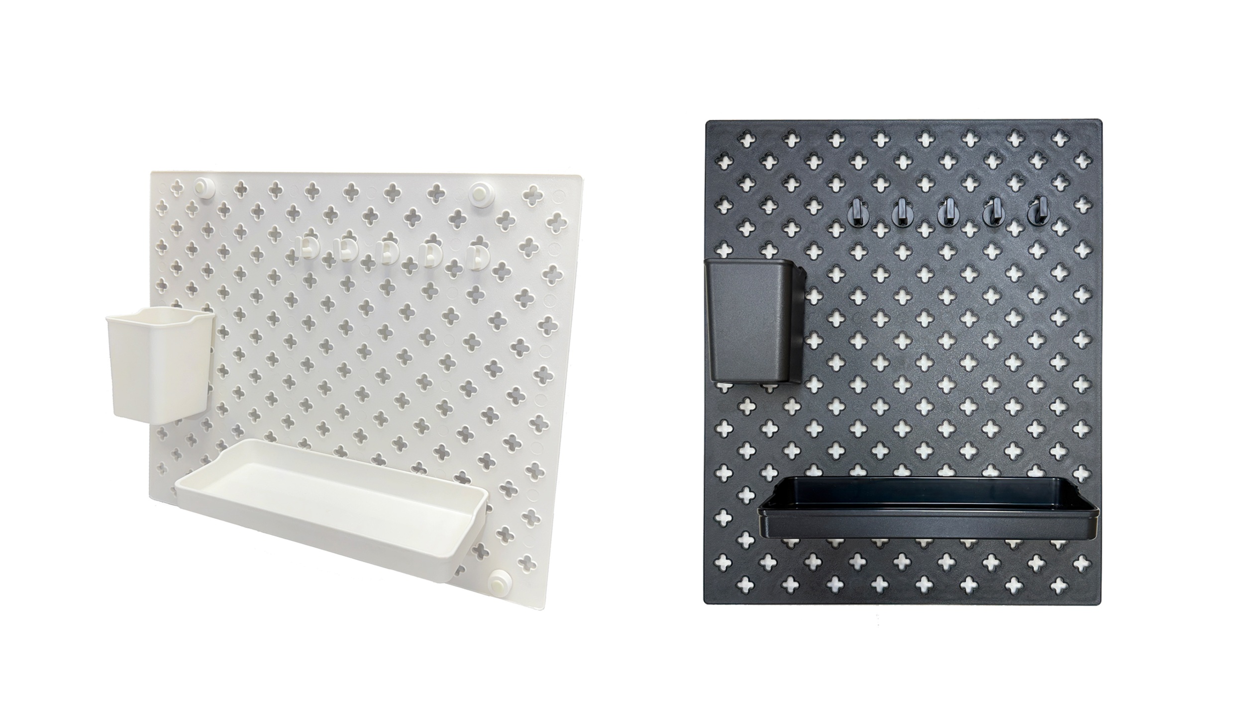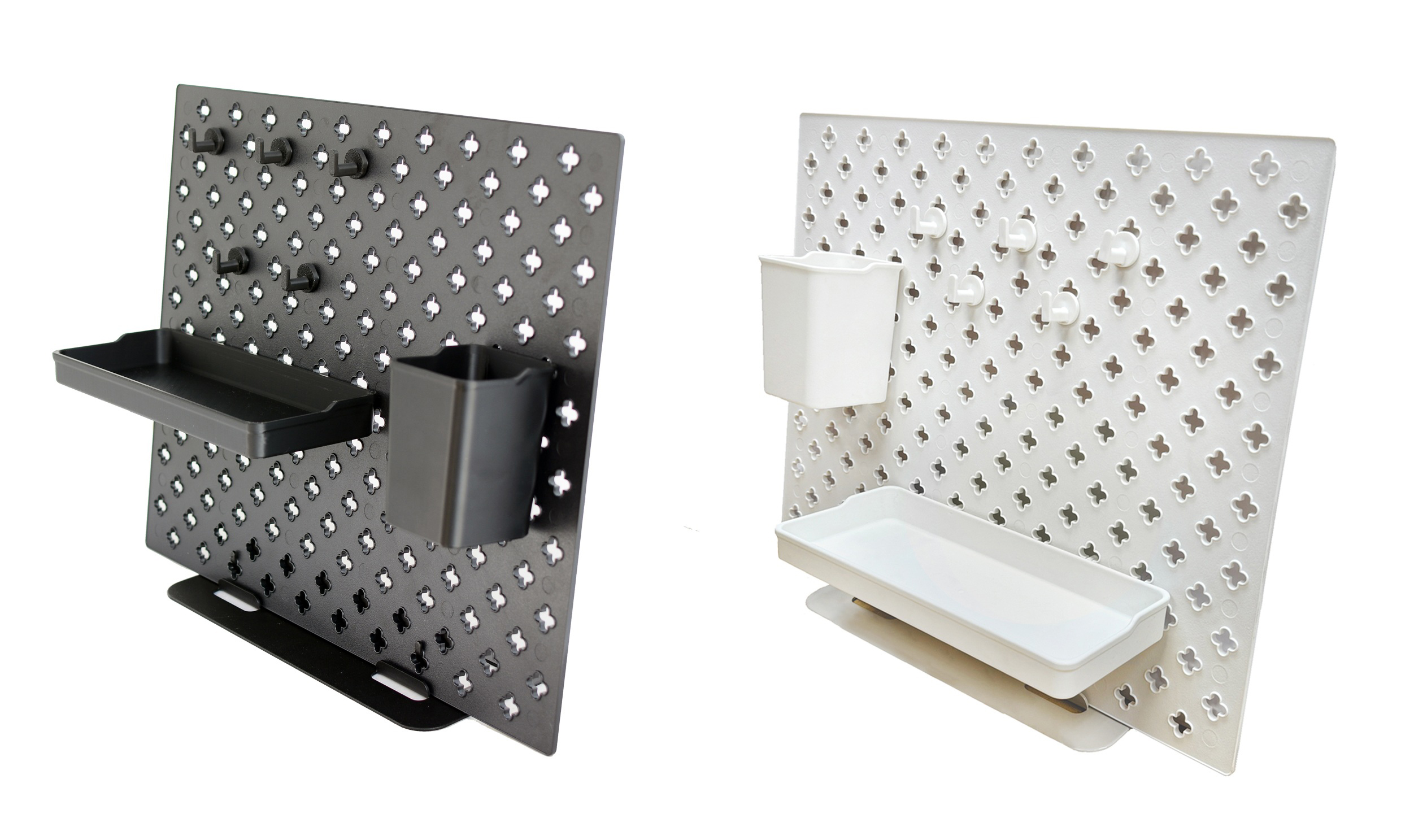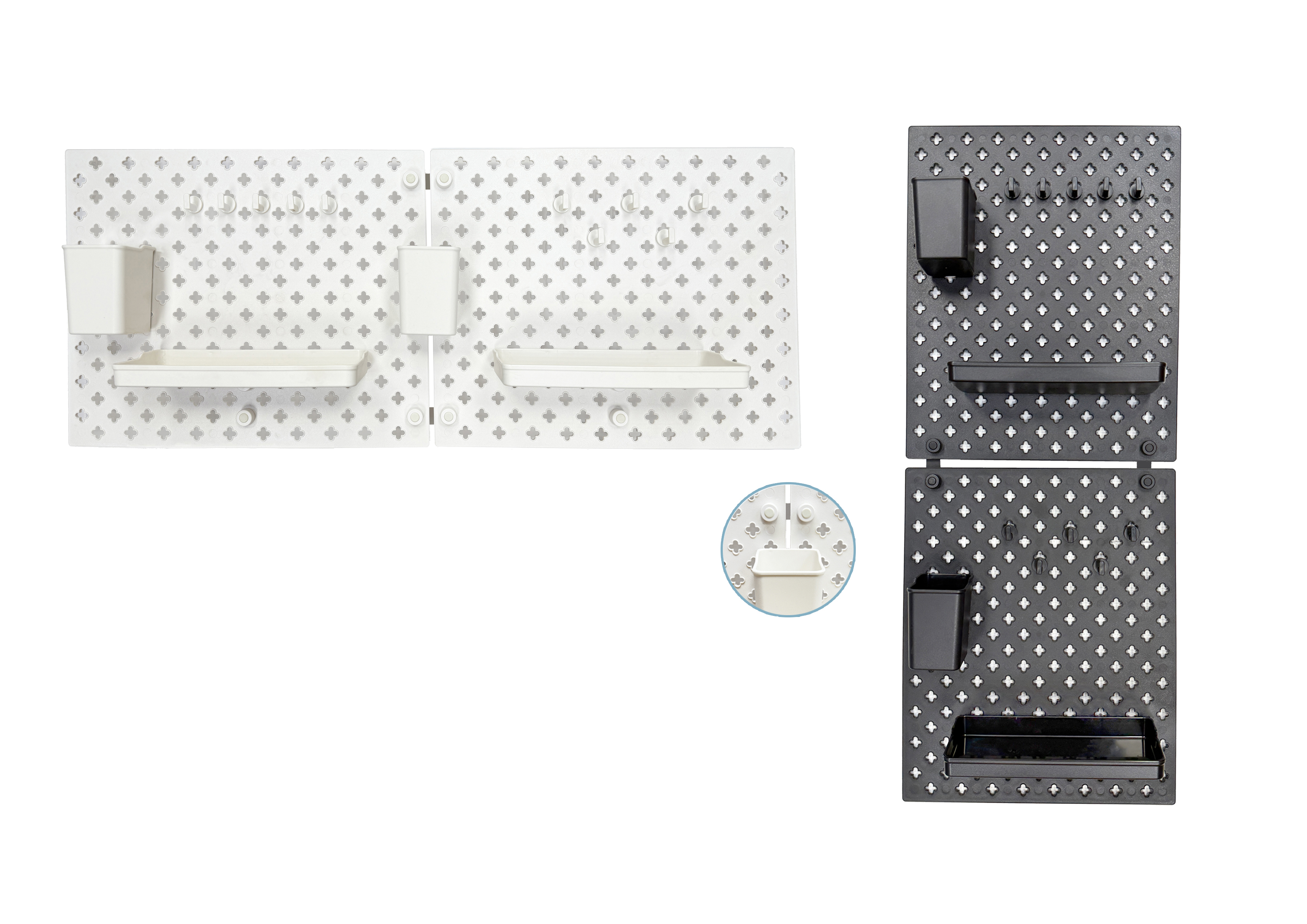 ITEM#SP-202 BLK / WHT Product Description: Storage Pegboard with connector Dimension : 43.5*17*35.5cm Material: ABS Product Includes:Pegboard x2,Container x2,Shelf x2, Hooks x10,Connector x2