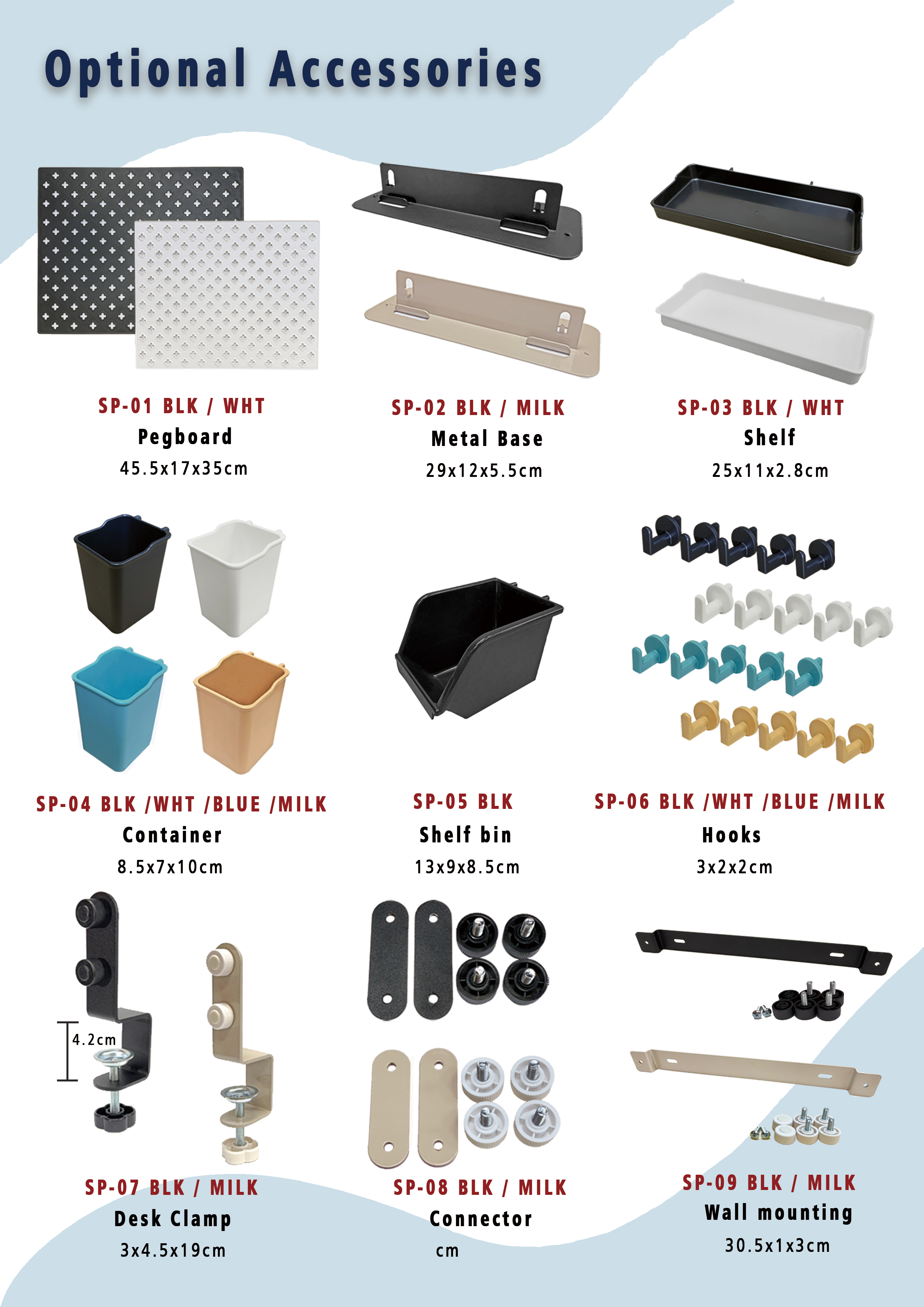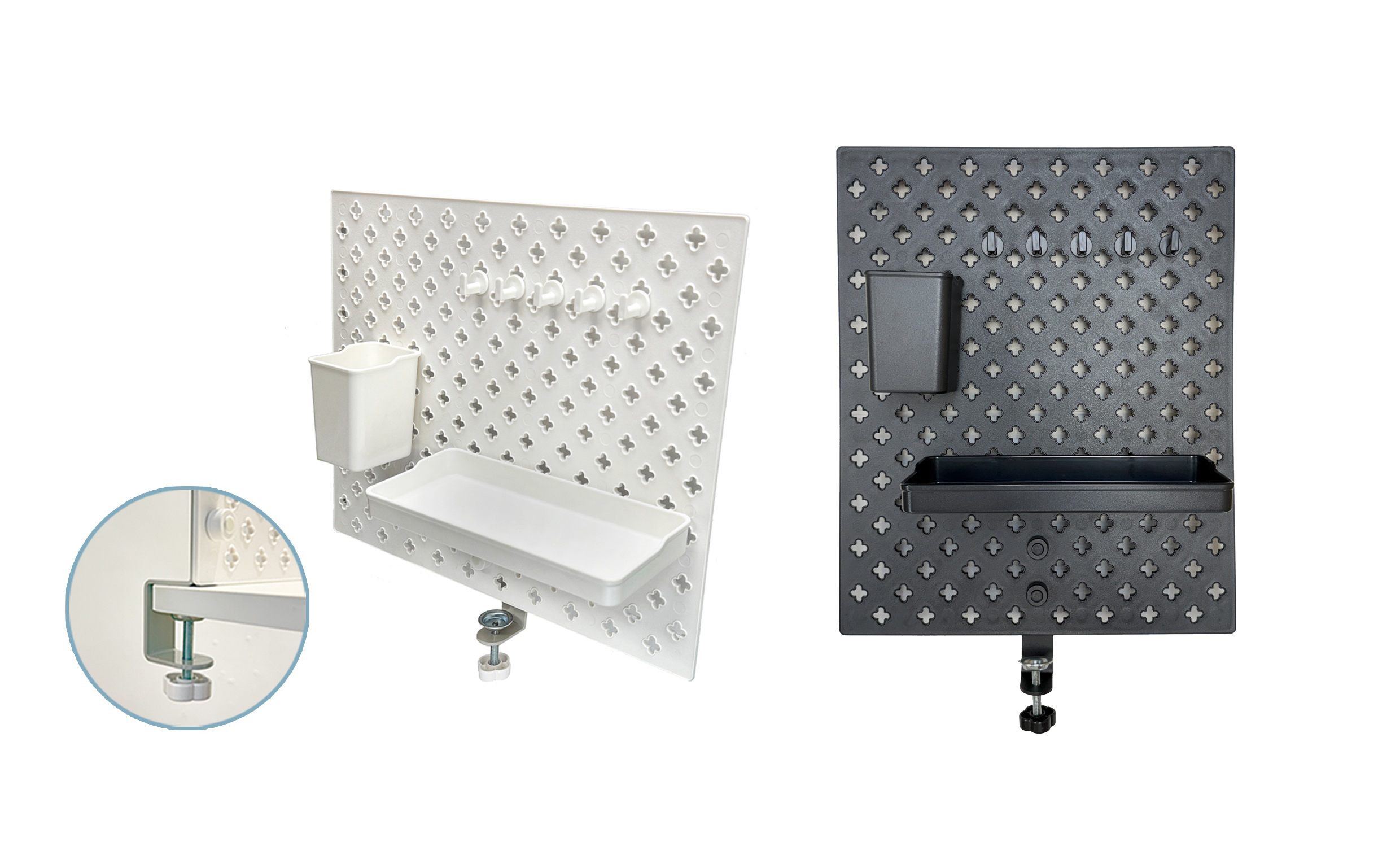 ITEM#SP-101 BLK / WHT Product Description:Storage Pegboard with desk clamp Dimension : 43.5*17*35.5cm Weight Material: ABS、Metal Product Includes:Pegboard x1,Container x1,Shelf x1, Hooks x5, desk clampx1