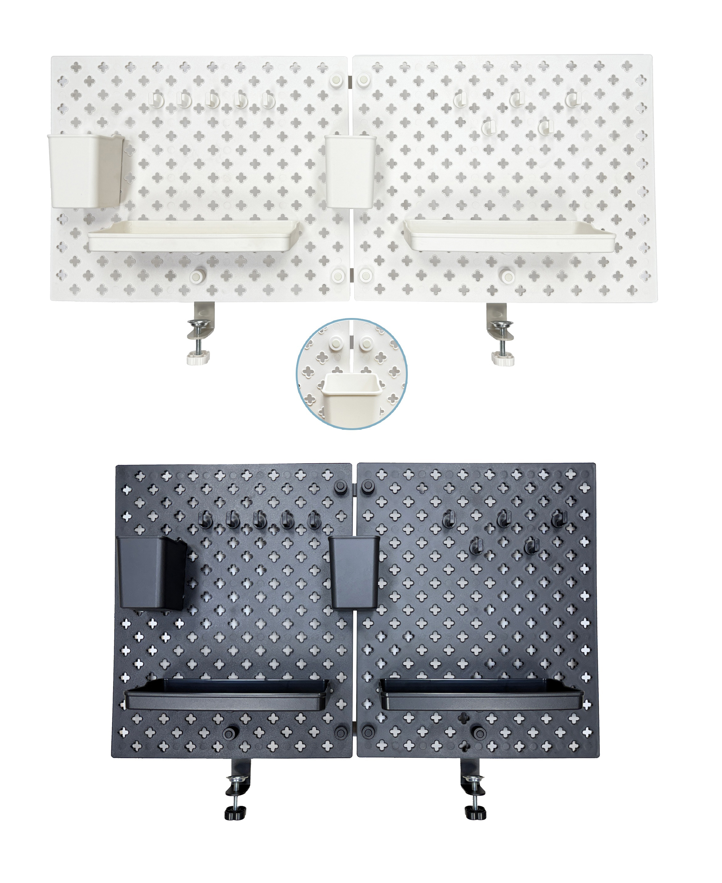ITEM#SP-201 BLK / WHT Product Description:Storage Pegboard with desk clamp and connector Dimension : 43.5*17*35.5cm Material: ABS、Metal Product Includes:Pegboard x2,Container x2,Shelf x2, Hooks x10, desk clampx2,Connector x2